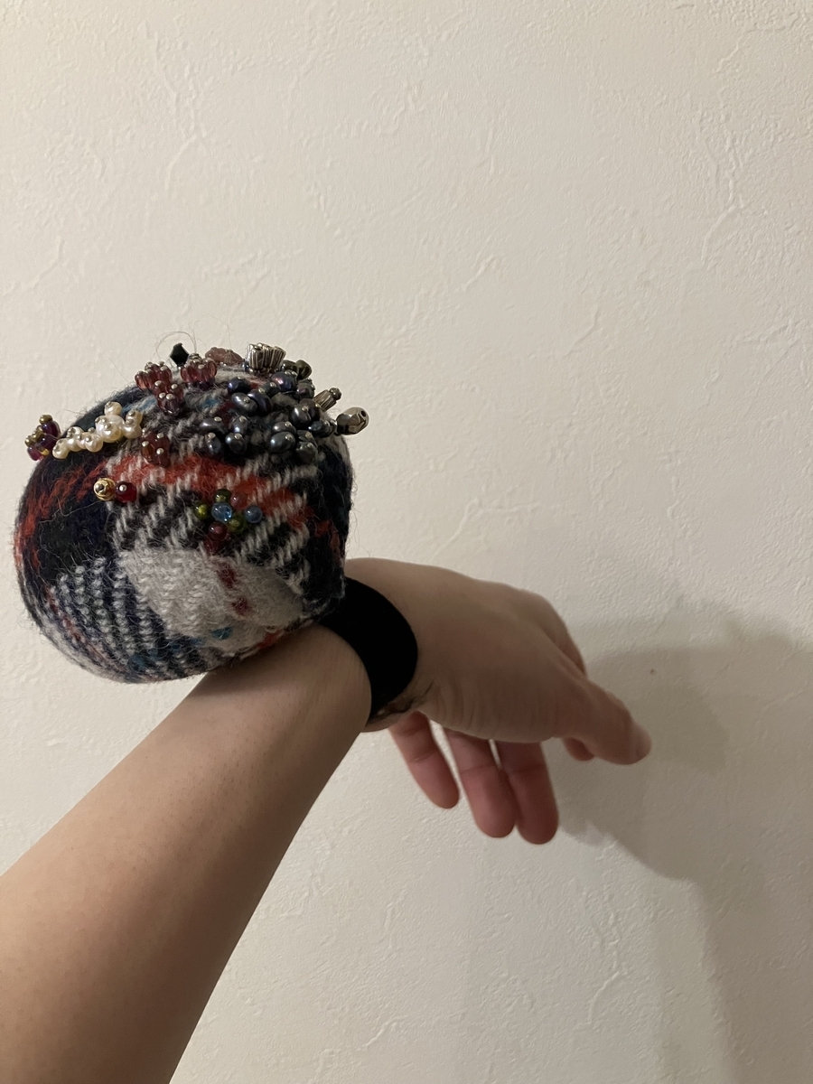 シルクピンにガラスビーズや淡水パールをぷちぷちつけて作りました。